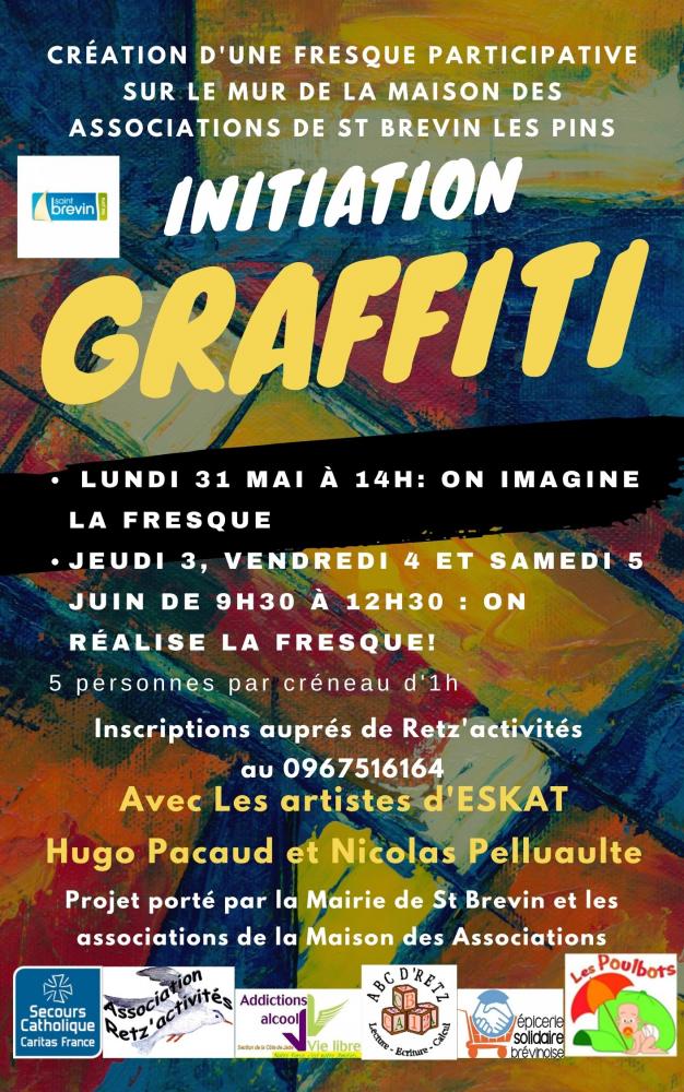 Sous l'impulsion de Retz'activités, 2 artistes, Eskat et l'OEil, accompagnent les usagers/bénévoles/administrateurs des associations siégeant dans la Maison des Associations de St Brevin les Pins pour réaliser une fresque à leur image, mettant en avant les valeurs de solidarité, partage, transmisssion .Jeudi 3, vendredi 4 et samedi 5 de 9h30 à 12h30, des ateliers participatifs sont mis en place pour sa rélalisation. N'hésitez à passer la voir !