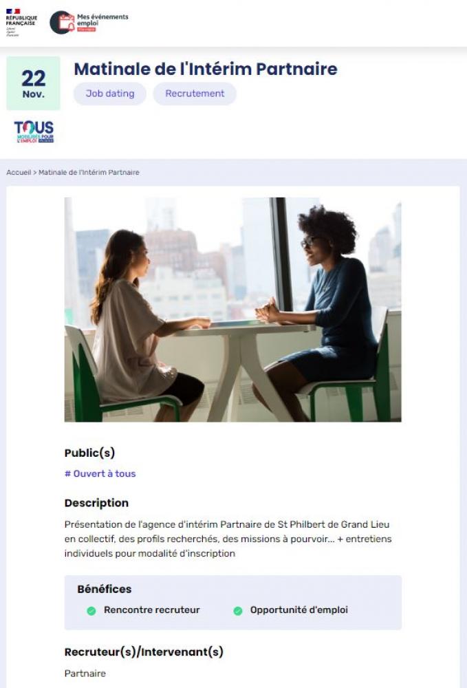 Présentation de l'agence d'intérim Partnaire de St Philbert de Grand Lieu, des profils recherchés, des missions à pourvoir... + entretiens individuels pour modalité d'inscription+ d'infos et inscription ⇒ https://mesevenementsemploi.pole-emploi.fr/mes-evenements-emploi/evenement/28598