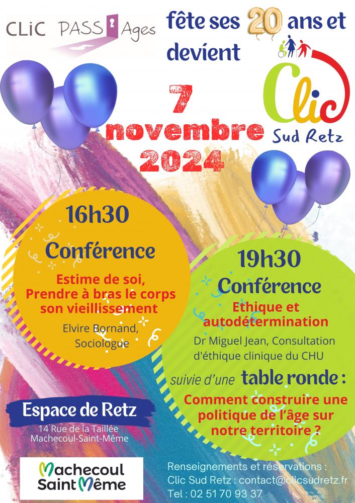 Fêtons les 20 ans du CLIC et sa nouvelle appellation CLIC SUD RETZ.2 TEMPS FORTS LE 7/11/2024 A L'ESPACE DE RETZ DE MACHECOUL SAINT MEME