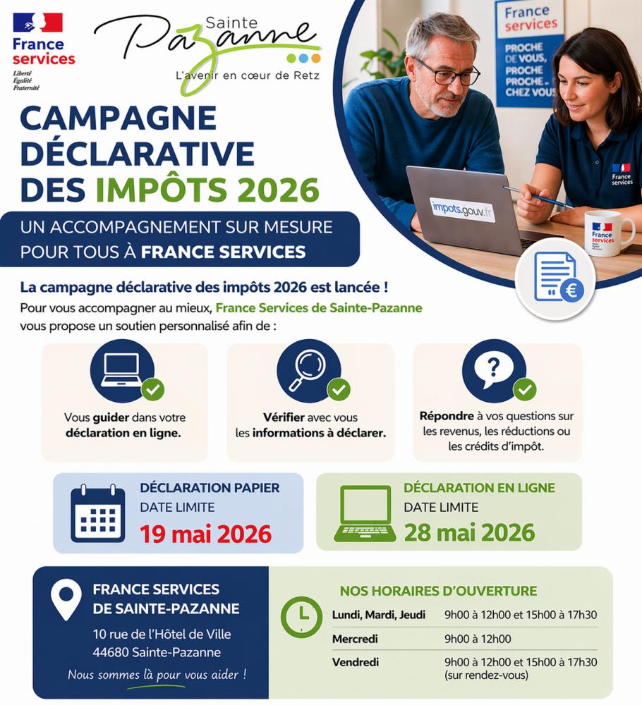Campagne déclarative des revenus 2025Le France Services de Sainte-Pazanne accompagne les usagers dans leurs déclarations de revenus en ligne.
